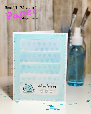 I decided to think happy thoughts and created a welcome card for a baby boy! I used my Zig watercolour markers, water and a paintbrush to create my striped background before adding some stenciled hearts. I also painted the frame using the blue used for my middle stripe. A sweet little hedgehog, sentiment and little heart embellishments finished things off.